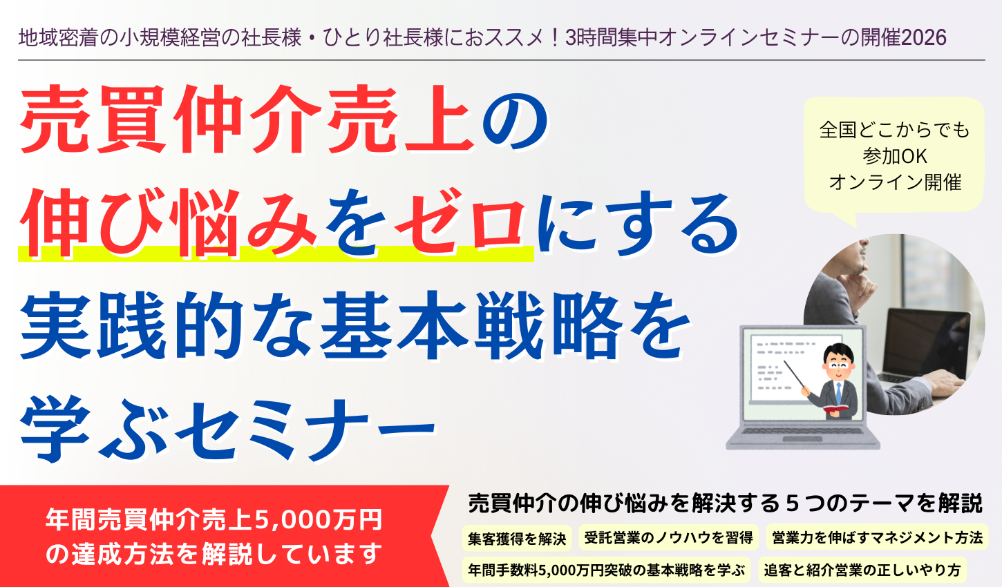 本セミナーは、年間の売買仲介手数料売上が数百万円だった会社が、5千万円突破のために実践した成功戦略を解説しています。売買仲介の基本戦略や年間売上5千万円を突破する方法を学ぶチャンスです。不動産業を営む社長様、新規参入した社長様、ひとり経営の社長様の方々にとって、このセミナーは大きな転機となることでしょう。さらに返金保証もあります。リスクを最小限に抑えながら、自身の成果を最大化するチャンスを掴むことができます。今こそ、不動産売買仲介業の成功に向けて一歩を踏み出す時です。